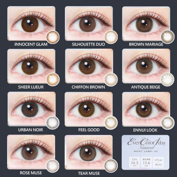 EverColor 1 Day Natural Moist Label UV系列是Ever Color最熱門銷售之一,也持續地走在彩妝隱形眼鏡市場的最前端。鏡片不單是顏色艶麗以及多元化,還有完善的功能去確保您眼睛的健康以及舒適度,比您想像的更透氣更濕潤!