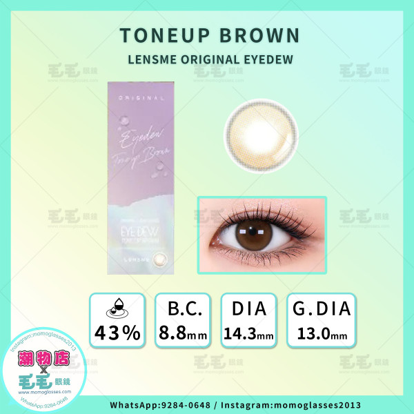 Lensme Original 1 Day EyeDew ToneUp Brown以透亮水光感為設計亮點,呈現出自然清新的瞳孔效果,讓眼神倍顯靈動、明亮且有層次感, 採用奶茶棕與柔金色的混合設計,與原生瞳孔自然融合,增添溫暖與高級感。
